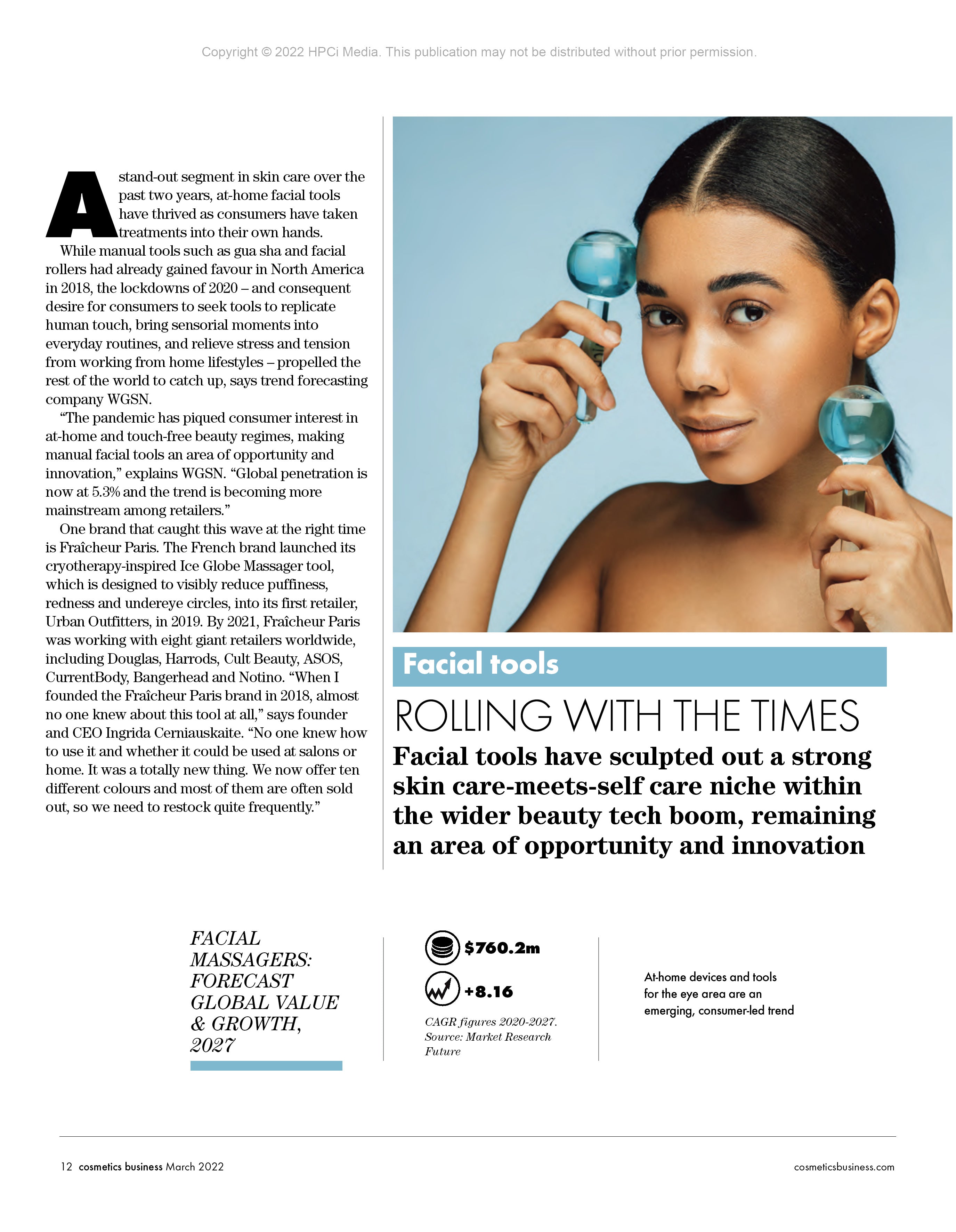 "The French brand launched its cryotherapy-inspired Ice Globe Massager tool, which is designed to visibly reduce puffiness, redness and undereye circles,"