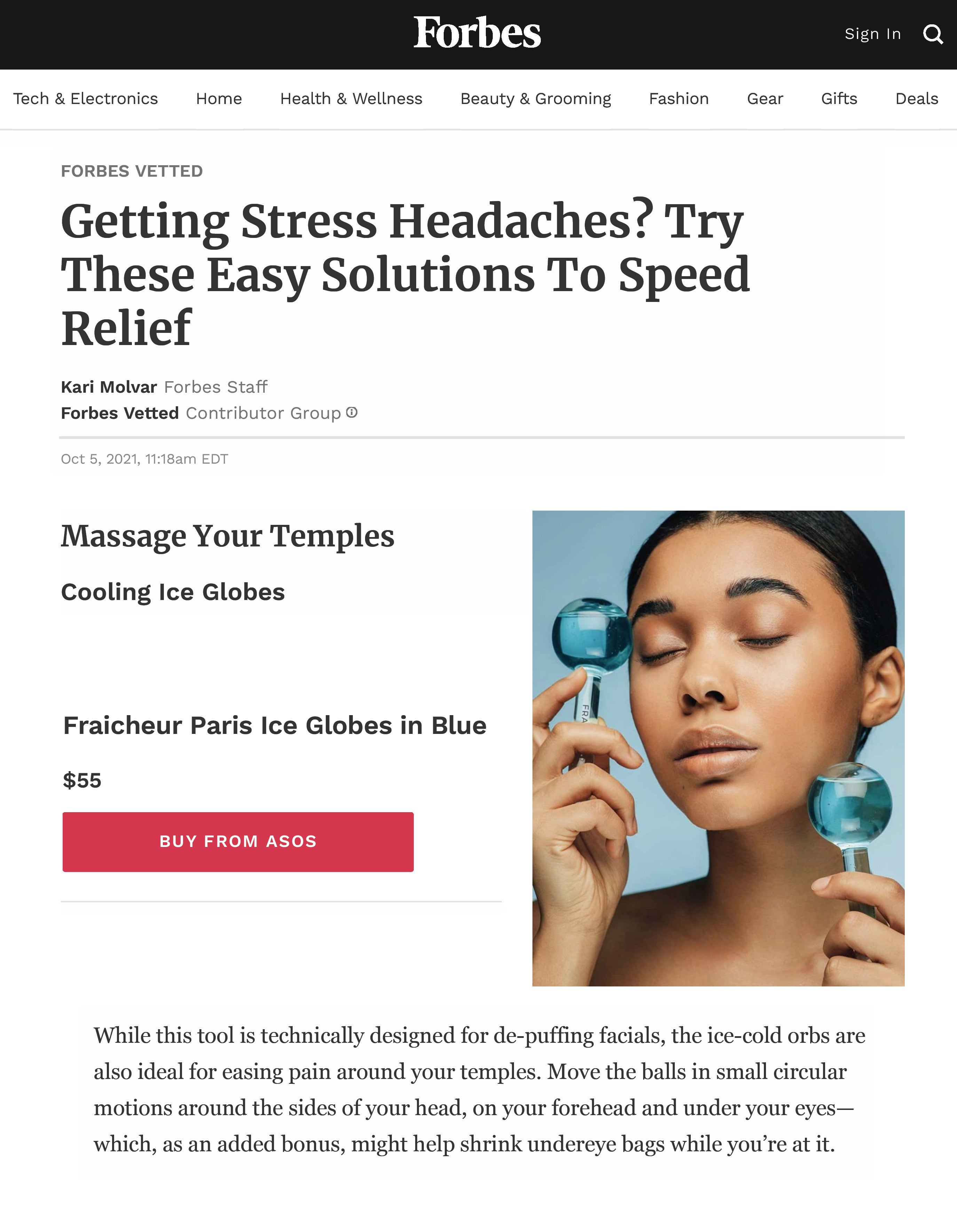 "While this tool is technically designed for de-puffing facials, the ice-cold orbs are ideal for easing pain around your temples."